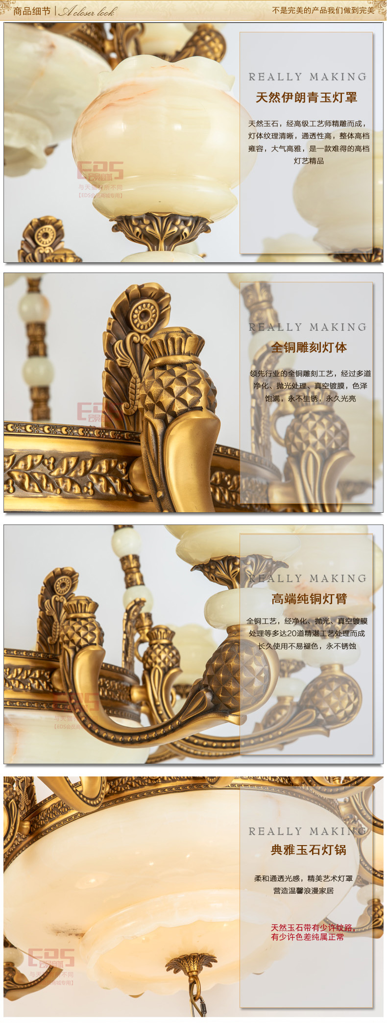 重声誉讲信用,铸就诚信形象!产品统一工厂生产发货,2年内质量问题包换,终身保修!诚信.创新.团队.上进 .打造世界一流全铜云石灯饰产品,引领高端全铜云石灯饰潮流!